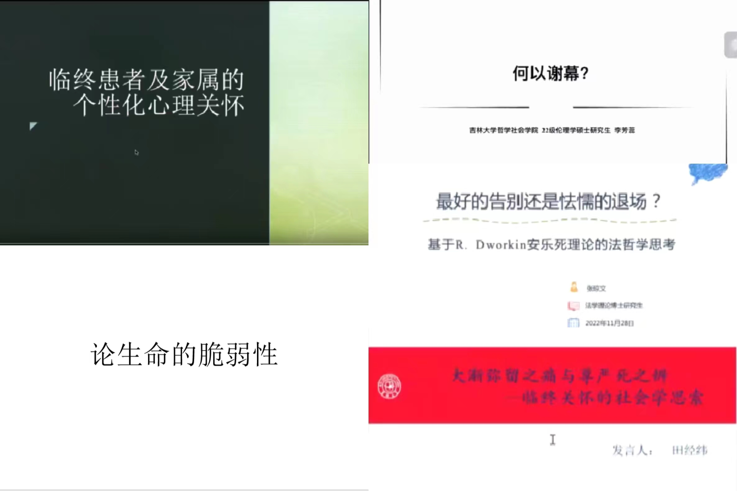 在发言中,来自白求恩第二临床医公司的白宇同学提倡将传统的“生物医学模式”转变为“叙事医学模式”,贯彻医学人文精神以维护生命尊严。社会心理学博士研究生王虹予详细介绍了“临终关怀”理论与实践的起源与发展,认为“临终关怀”在面向患者的同时也要保持对患者家属的关切。法理学博士研究生张琼文反驳了用“投入-浪费”理论衡量生命价值的方式,点明在生死问题上应当尊重主体的“关键利益”。伦理学硕士研究生李芳蕊揭示了“临终关怀”实践中的三大困境,提出应当以人为核心构建“临终关怀”的理论与实践体系。社会学博士研究生田经纬分享了社会学研究中关于“已死-濒死”的讨论,着重介绍了“安宁疗护”社会工作的价值。伦理学博士研究生王宝锋认为可以用面向生命“脆弱性”的研究方法代替传统研究中面向生命“独特性”的方法,并阐明了生命脆弱性的本质与三种脆弱性类型。