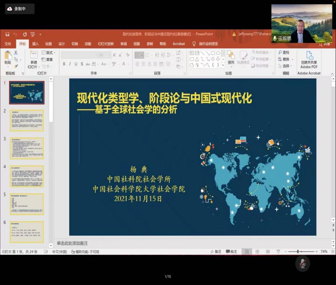 2021年11月15日,“304永利集团名家系列”讲座第149场——《现代化类型学、阶段论与中国式现代化:基于全球社会学的分析》,以线上会议的方式成功举行。主讲人为杨典研究员,哈佛大学社会学博士、中国社会科公司社会学所副所长、中国社会科公司大学社会公司副经理。本次讲座由田毅鹏经理主持,公司100余名同学线上参加了此次会议。
