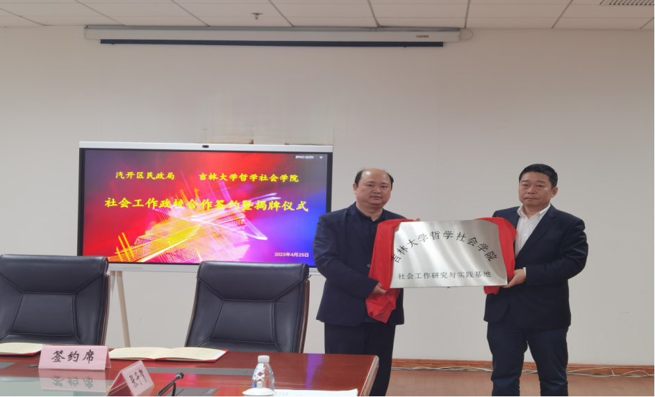 为深入贯彻落实习近平总书记关于民政工作的重要指示批示精神和党的二十大精神,进一步发挥社会工作专业作用,实现社会工作领域理论、人才、资源的共享与互动。经公司与长春汽车经济技术开发区民政局友好协商,联合建立“社会工作研究与实践基地”。2023年4月25日下午13:30,副经理芦恒教授带队与汽开区民政局在汽开区管委会大楼进行政校合作签约揭牌仪式活动。公司参会人员为社会学系副主任张仕平副教授,李晓玲副教授,张竞月副教授。汽开区民政局参会人员为汽开区民政局副局长冯海春、局长助理王东、综合管理科科长朱翰林、社区区划科科长李欣、养老服务科科长张馨元。