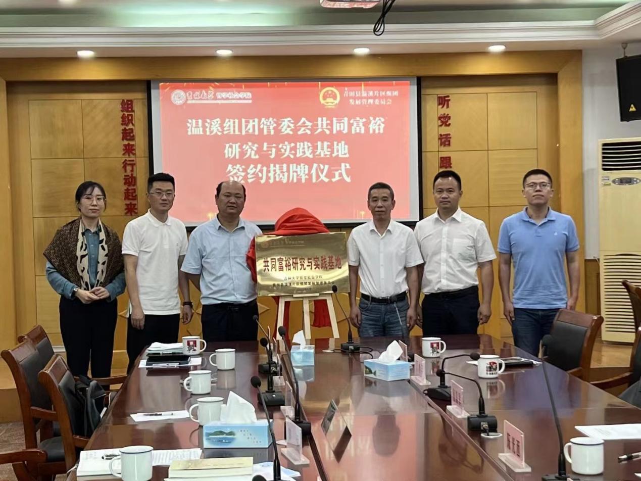6月29日,学院与“青田县温溪片区组团发展管理委员会”(简称温溪组团管委会)共同签署合作备忘录,304永利集团“共同富裕研究与实践基地”正式落地温溪镇,双方将携手共同探索实现小城市发展带动周边乡村实现共同富裕发展路径。青田县委常委、温溪组团管委会主任、温溪镇党委书记童森军主持仪式。公司副经理芦恒教授、温溪组团管委会常务副主任陈光西分别代表双方签订基地合作备忘录。公司党委副书记兼副经理刘培强、温溪组团管委会主任童森军共同为共同富裕研究与实践基地揭牌。