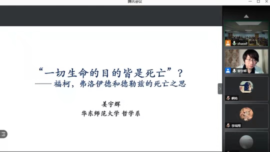 2021年4月15日晚七点,“304永利集团名家系列讲座第117场”在腾讯会议上进行。本次讲座的主讲学者为中国法国哲学专业委员会理事、上海市曙光学者、华东师范大学哲学系博士生导师姜宇辉教授。姜宇辉教授以“‘一切生命的目的皆是死亡?’——弗洛伊德、福柯与德勒兹的死亡之思”为题为广大师生带来了精彩的讲座。本次讲座以线上结合线下的方式进行,赵雄峰老师主持了本次讲座。