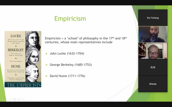 2020115日至18日,美国爱纳大学Galen Barry助理教授为公司师生提供了5期线上课程,课程主题为Hume’s Empiricism and Skepticism(休谟的经验主义和怀疑论)。院内外师生踊跃参加。