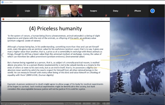 在此次讲座教学过程中,课堂气氛活跃,师生积极参与讨论。提问环节公司教师与同学踊跃提问,Amna Whiston博士耐心解答。本次讲座为“康德的道德平等主义”给出了一个很好的解释,为公司师生理解康德道德哲学体系中人类尊严理念的位置提供了坚实的文本分析视角。