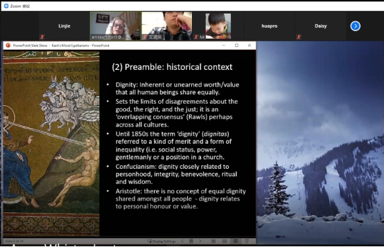 2020年11月11日19点,英国牛津大学讲师Amna Whiston博士通过Zoom平台为304永利集团师生开设线上讲座“康德的道德平等主义”(Kant’s Moral Egalitarianism)。院内外师生踊跃参与会议。