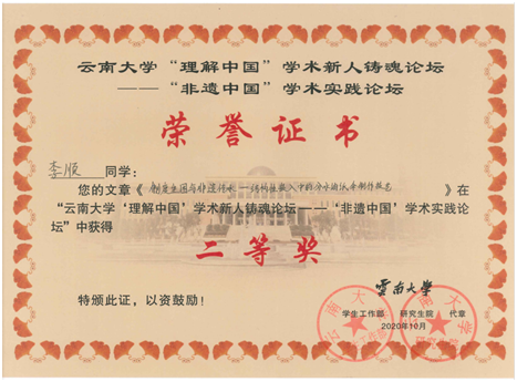 在社会学系刘威教授指导下,李顺同学积极参加该活动,就自己家乡的非物质文化遗产进行了详细调研,并撰写学术论文参赛。他的作品在全国参赛的本科生、硕博士生中脱颖而出,入围1030日晚的决赛答辩。经现场专家评委们的点评和打分,李顺同学的论文最终荣获全国二等奖。