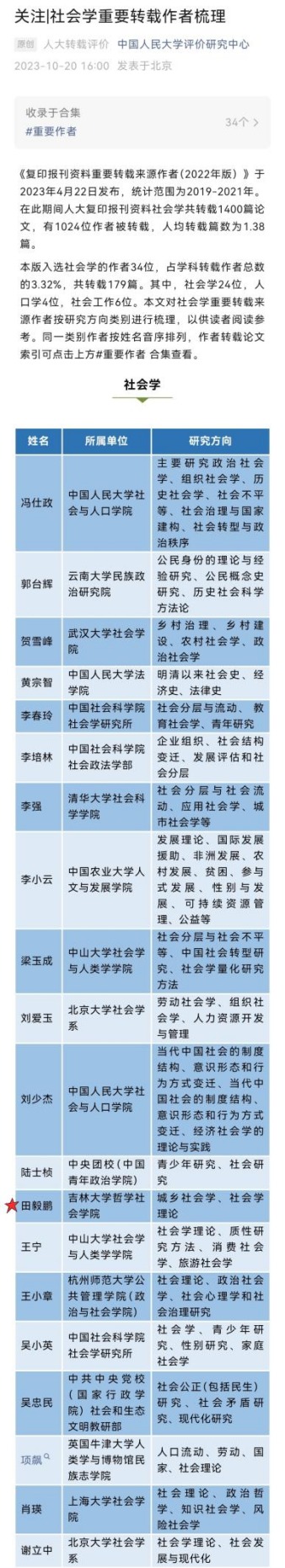 其中,公司田毅鹏教授入选社会学重要转载作者,向田毅鹏教授表示热烈祝贺!