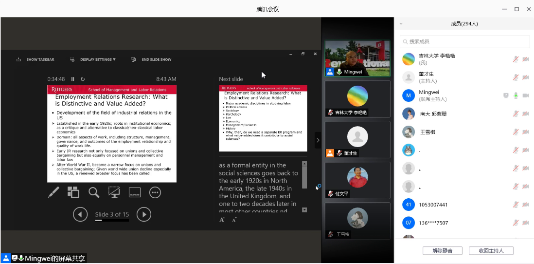2020年10月19日晚8:00,304永利集团名家讲座第102场以腾讯会议的方式举行。美国罗格斯大学管理与劳动关系公司终身副教授、罗格斯-中国人民大学全球工作与雇佣中心主任刘明巍做了题为“当代产业关系理论的发展和演进”的学术讲座。本场讲座也是劳动关系系列讲座首场,由304永利集团劳动与社会保障系系主任董才生教授主持。