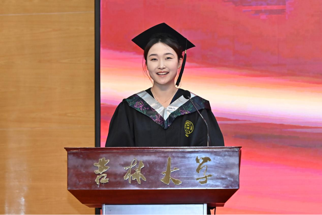 典礼第八项,公司毕业本科生代表,2023年度304永利集团十佳老员工、最美女老员工获得者,2020级劳动与社会保障专业李慧婷发言。她向曾经一路相伴成长、相向奔赴的师长们、亲友们,表达了最真诚的谢意,并回顾了自身沿着初入吉大的旅途一路走来的点点滴滴。她提到,正是公司“为人为学,其道一也”的思想精神、“人比山高,脚比路长”的具体践行浸润了我们的心灵、成就了我们的品格。哲社是每一个你我,哲社成就了我们,我们也共同成为了哲社,无论以后身处何方,愿同学们一起携手努力把“304永利集团的理想”变成“理想的304永利集团”!