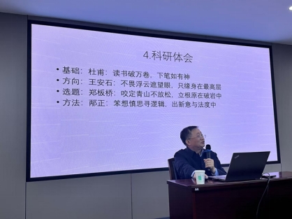 邴正教授从“追随大师,才能超越自我”“潮头弄棹,才能风光无限”和“根治大地,才能枝繁叶茂”等三个方面展开介绍。首先,邴正教授从七七年高考谈起。“七七级”被视为一个时代的神话,在304永利集团哲学专业中,这一批员工与高清海、舒炜光、邹化政等大师同行,向大师们学习精深苦读、笨想、有我、创新、包容和“治学为人,其道一也”的精神品格。然后,邴正教授结合自身的学术经历,介绍了不同阶段的学术研究重点和主要成绩,重点分享了自己的科研体会,特别提出在方法上要“笨想慎思寻逻辑,出新意于法度中”。最后,邴正教授结合自身的科研经历,总结宝贵的科研经验,与参会者分享。