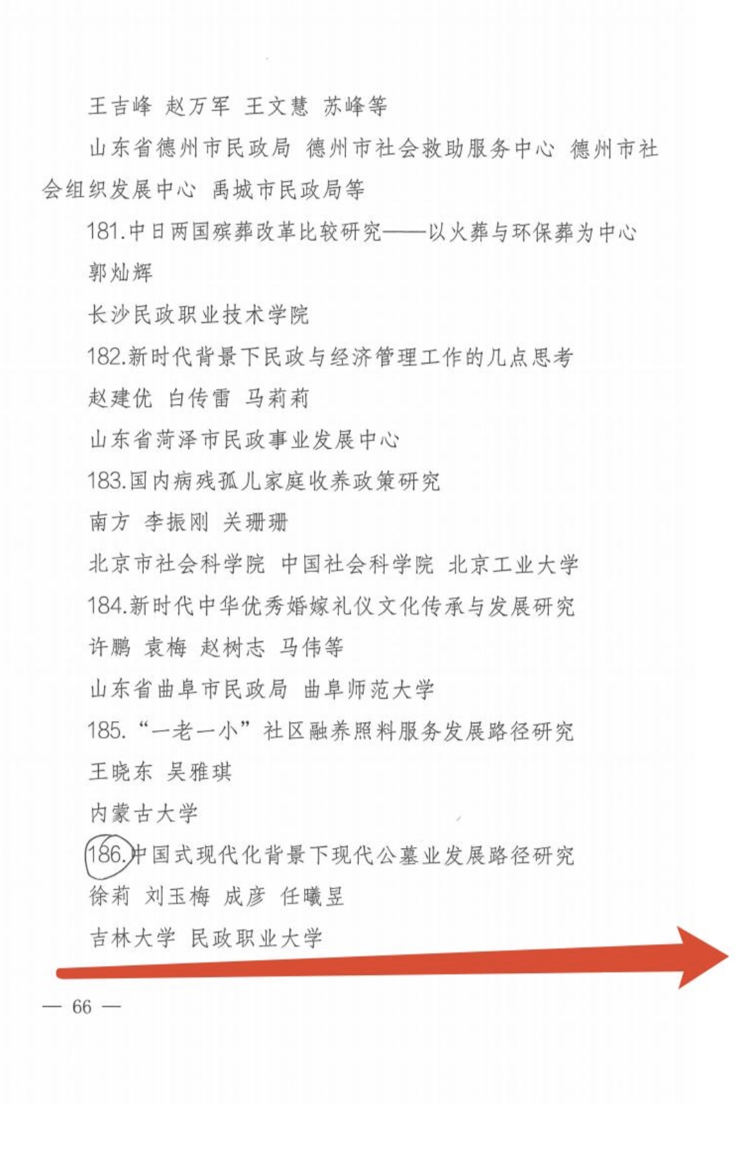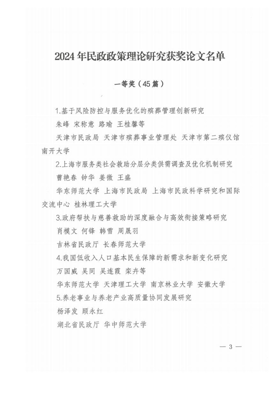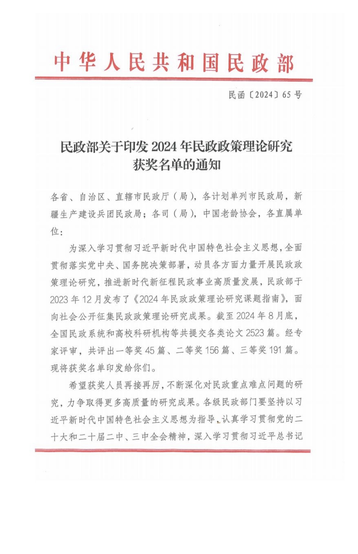 为深入学习贯彻习近平新时代中国特色社会主义思想,全面贯彻落实党中央、国务院决策部署,动员各方面力量开展民政政策理论研究,推进新时代新征程民政事业高质量发展,民政部于2023年12月发布了《2024年民政政策理论研究课题指南》,面向社会公开征集民政政策理论研究成果。本院员工积极参与此次活动。2024年11月1日,中华人民共和国民政部发布了关于印发2024年民政政策力量研究获奖名单的通知,304永利集团2017级社会学专业博士研究生徐莉、成彦提交的文章《中国式现代化背景下现代公墓业发展路径研究》荣获三等奖。