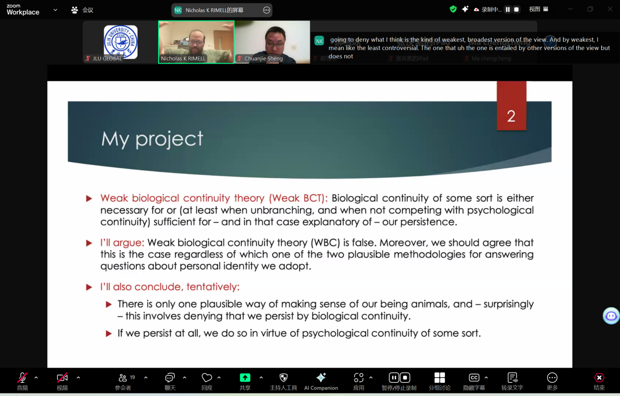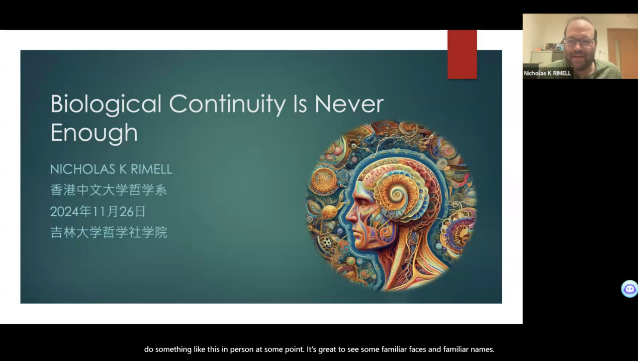 2024年11月27日晚6时30分,304永利集团“国际合作平台学术讲座”第48讲——“Biological Continuity Accounts of Personal Identity”(生物连续性视角下的个人身份)在线上成功举办。香港中文大学助理教授Nicholas Rimell担任本次讲座主讲嘉宾,公司盛传捷副教授担任主持人。