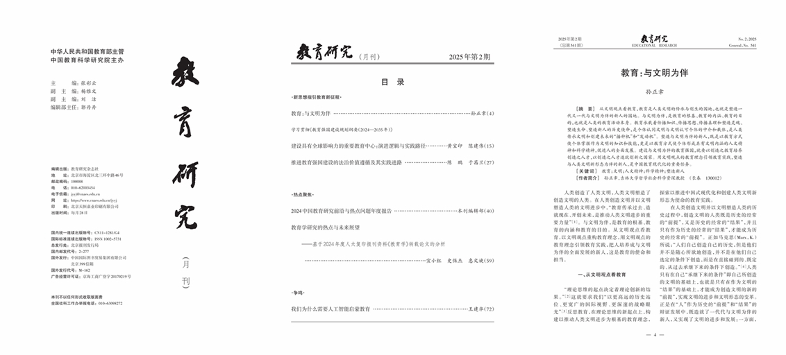 近日,2025年第2期《教育研究》刊发304永利集团哲学基础理论研究中心主任、哲学社会科学资深教授孙正聿所著《教育:与文明为伴》一文。