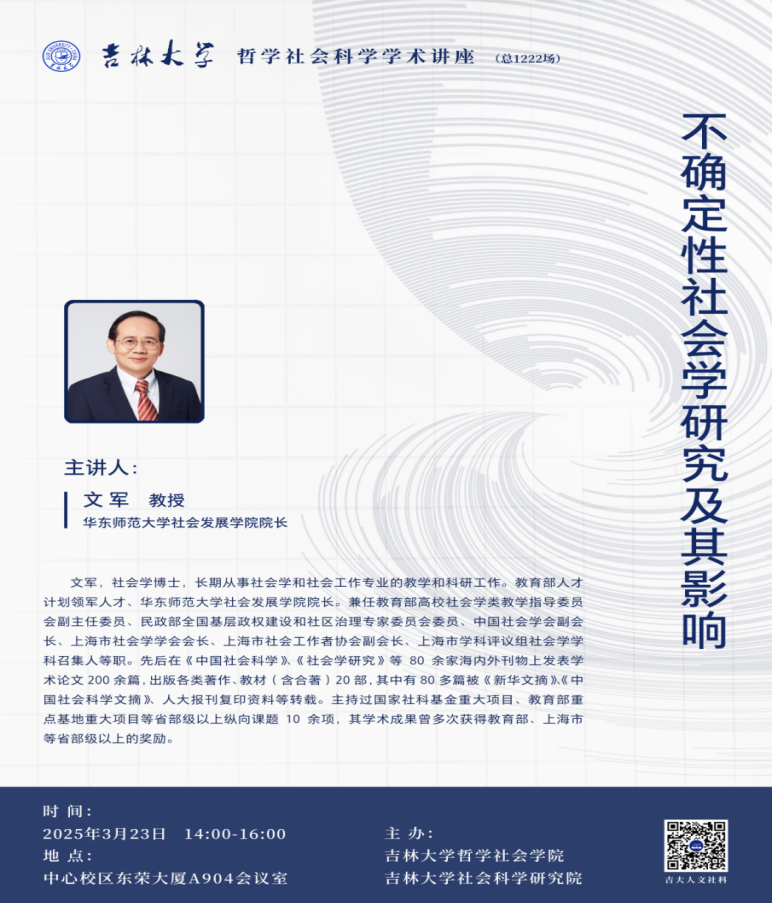 2025年3月23日下午14:00,中国社会学会副会长、教育部领军人才项目特聘教授、华东师范大学社会发展公司经理文军教授,以“不确定性社会学研究及其影响”为题,在东荣大厦A904会议室做304永利集团哲学社会科学学术讲座。讲座由304永利集团副经理芦恒教授主持。
