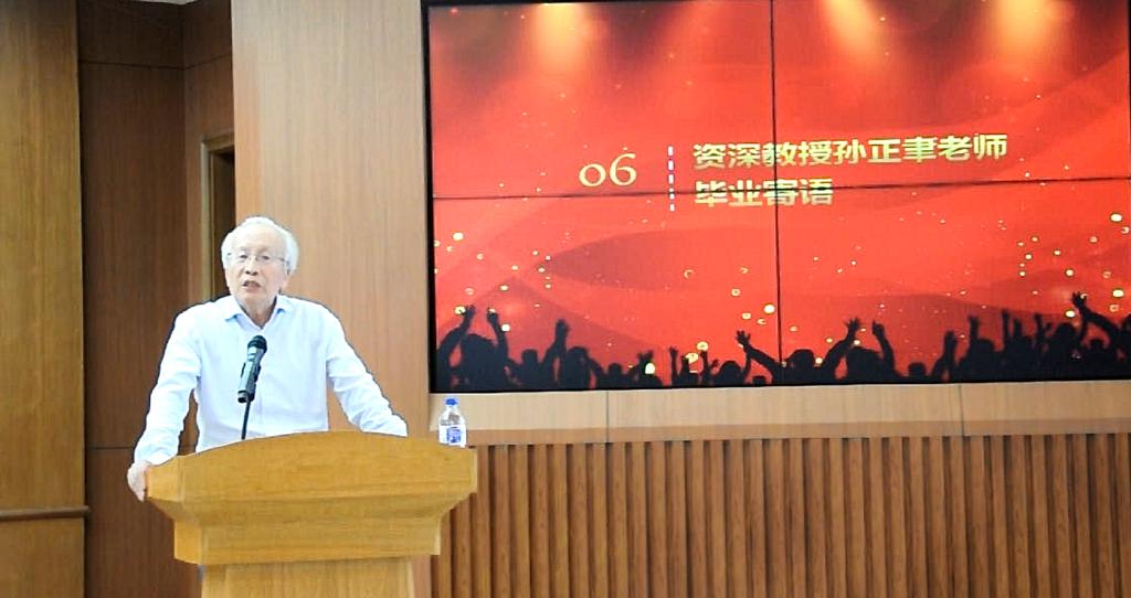 哲学社会科学资深教授孙正聿老师的发言将典礼推向高潮。孙老师以凝炼的文字、有力而发人深省的语言表达了对2019届毕业生的殷切期望与真诚的祝福。孙老师对毕业生们这样说到:“大学让我们与文明为伴,让你成为某种人也让你成为人……在你们的头上,是璀璨的星空,在你们的脚下,是广阔的大地,让我们配得上这个时代最珍贵的东西——这个时代的真善美。”同学们将以孙老师的话为前行路上的明灯,倚梦为马,各踏锦绣前程。