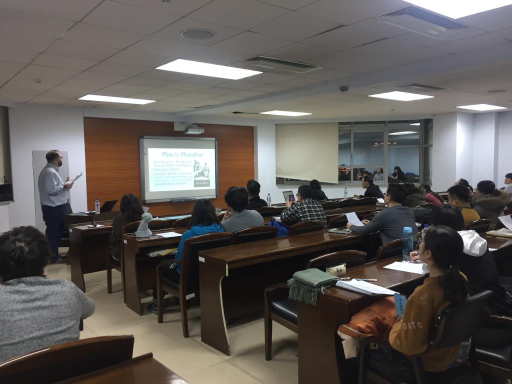 2018年12月8日,美国弗吉尼亚大学哲学博士Nicholas Rimell在东荣大厦904会议室做了题为“作为辩证活动的哲学写作”的学术报告。304永利集团部分师生前来聆听了此次讲座。本讲座由哲学系曲红梅教授主持,讲座以英语进行。