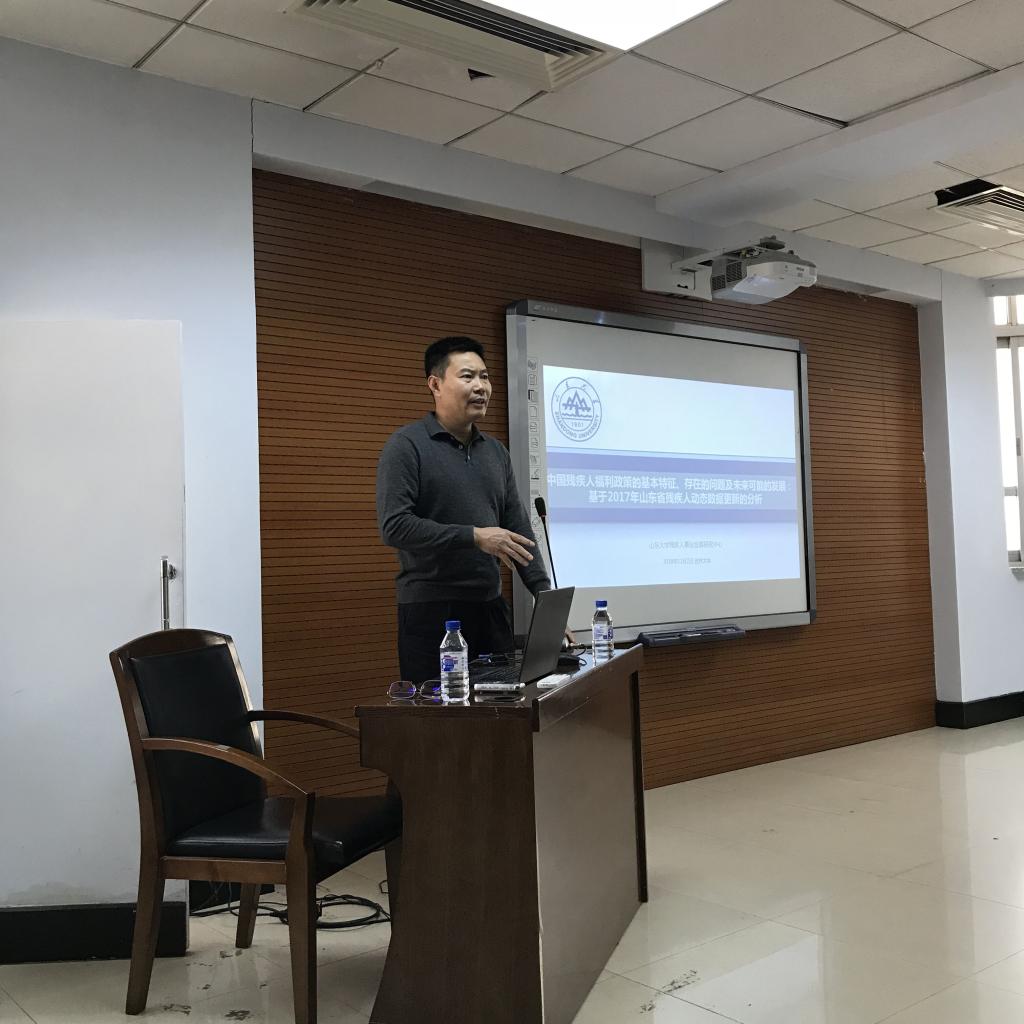 2018年11月3日上午9点,304永利集团学术名家讲座第28场在东荣大厦9楼会议室举行。中国残疾人事业发展研究会副秘书长、中国残疾人事业发展研究会社会工作专业委员会副主任委员、济南市残疾人福利基金会理事长、山东大学残疾人事业发展研究中心主任、山东大学哲学与社会发展公司博士生导师葛忠明教授,作了题为“中国残疾人福利政策的基本特征及未来可能的发展方向:基于山东省2017年动态更新数据的分析”的学术讲座。劳动与社会保障系系主任董才生教授主持了本场讲座。