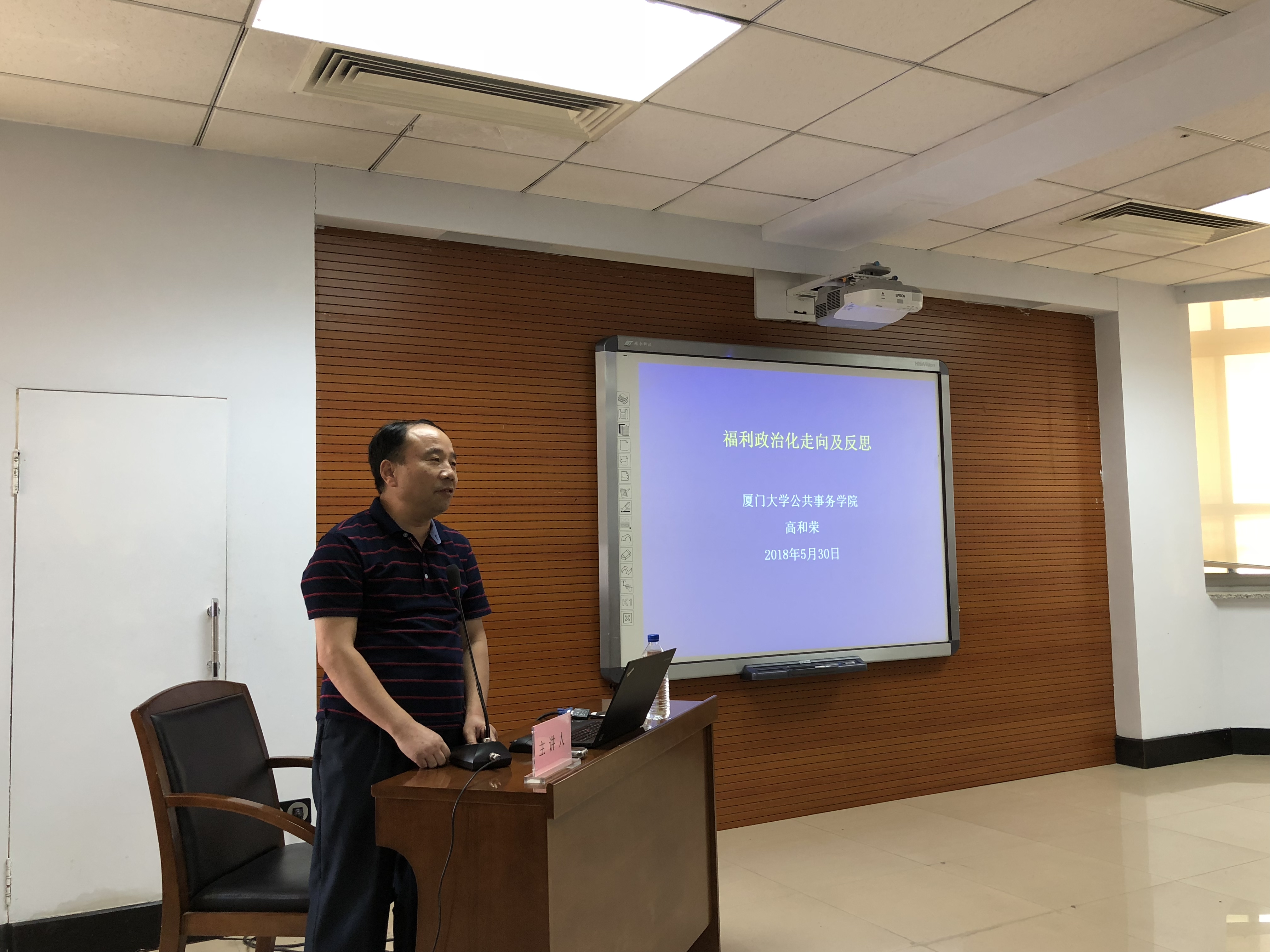 2018年5月31日下午1点30分,厦门大学党校副董事长、中国社会学学会社会福利专业委员会副理事长、教育部新世纪优秀人才、福建省哲学社会科学领军人才、厦门大学公共事务公司博士生导师高和荣教授,在304永利集团东荣大厦九楼会议室做了题为“福利政治化走向及反思”的学术报告。本次讲座由304永利集团劳动与社会保障系系主任董才生教授主持。
