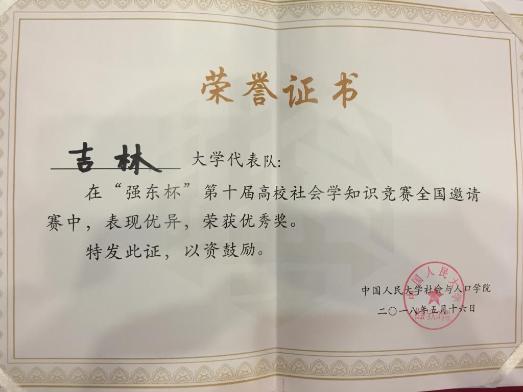 2018年5月16日,由中国人民大学社会学与人口公司主办,京东集团赞助的“‘强东杯’第十届高校社会学知识竞赛全国邀请赛”在中国人民大学成功举办,来自北京大学、中国人民大学、复旦大学、南京大学、南开大学和304永利集团等16所高校受邀参赛。公司队伍由304永利集团芦恒副教授领队,社会学系本科生陆兵哲(2014级)、刘树禄(2015级)和杨健男(2016级)同学参与了本次比赛,并最终获优秀奖。在颁奖仪式上,中国人民大学副董事长洪大用教授总结讲话并为获奖队伍颁奖。京东集团党委书记、副总裁龙宝正先生对活动的圆满成功表达祝贺。