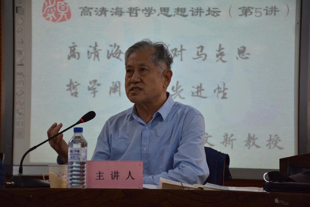 高文新教授通过人类哲学思维发展的逻辑,马克思哲学的精神,高清海先生对马克思哲学的创新性解读,人类解放与哲学创新四个部分系统阐述了高清海先生对马克思哲学阐释的先进性。关于人类哲学思维发展的逻辑,高文新教授认为,人类哲学经历了从思考“世界是什么”的“儿童时期”到思考“人是什么”的成熟期的思维方式的转变。他特别指出:高清海先生的一大贡献就是致力于使中国哲学界摆脱在“世界是什么”的追问前提下陷入的唯物与唯心的争论,而将目光转换到思考当前中国人面临的问题是什么。关于马克思哲学的精神,高文新教授特别强调,理解马克思哲学精神的起点是人本化。人本化是欧洲近代哲学发展的主导线索,但马克思与传统西方哲学家的区别在于“如何理解人”。马克思理解的人是“具体的”而非“抽象的”,是各种社会关系的总和,而这些社会关系的根源在于劳动。从劳动出发来理解人是马克思的创见,把实践放在核心位置才是理解马克思哲学精神的钥匙,对马克思哲学进行本体论式的解读并不符合马克思哲学的本意。关于高清海先生对马克思哲学的创新性解读,高文新教授指出,欧洲哲学史黄山会议后高清海先生认识到:哲学不是当时中国哲学界通常所认为的本体论体系,真正意义的人类哲学史实质上乃是一部认识史。由此出发,他主持编写了《马克思主义哲学基础》教科书,系统阐明了从古代哲学的直观认识到马克思哲学的科学认识的哲学发展脉络。本书的出版冲破了传统教科书体系哲学,使中国学界对马克思主义哲学的认识从本体论阶段和水平进入到认识论阶段和水平,极具解放意义。在此基础上,并经多年研究,高清海先生最终达到了如下认识,即“马克思哲学是实践思维方式的哲学”。最后,关于人类解放与哲学创新。高文新教授强调,高清海先生的类哲学大体上是说,阶级社会下个人与“类”不再一致,只有解决了人与人之间的社会差别,类与个体才能重新达成统一,因而实质上乃是马克思人类解放思想的当代哲学表述。而当代中国的马克思主义哲学创新最不能忘却和脱离的就是马克思人类解放的思想,更不能被当代西方资产阶级的一些对资本主义制度进性修补的新理论所迷惑。