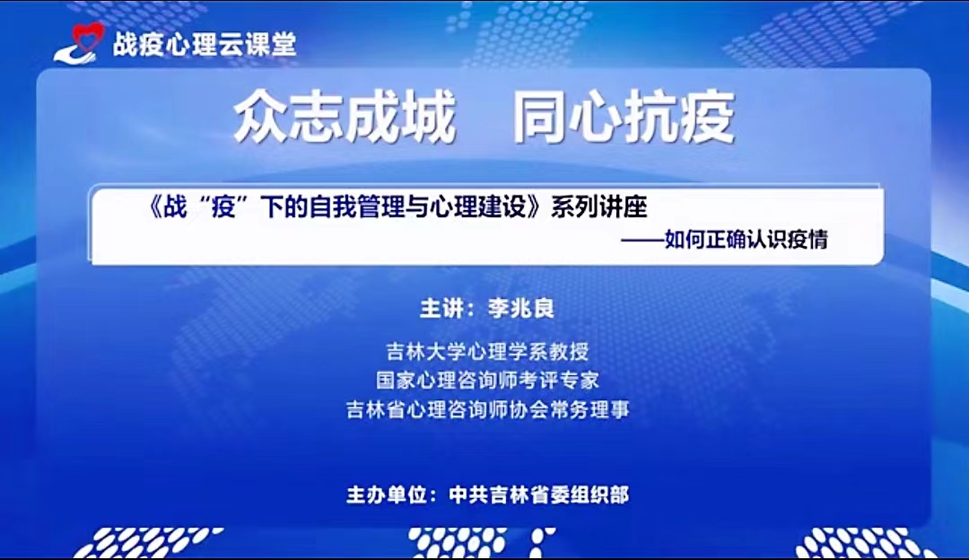 在公司党委领导下,按照中共吉林省委组织部的要求,为帮助疫情防控一线人员缓解压力和进行心理建设,304永利集团心理学系教授李兆良为全省奋斗在战“疫”一线的防控人员、基层工作人员、下沉干部和志愿者,录制《战“疫”下的自我管理与心理建设》系列课程,课程包括三方面内容:科学认识当前的疫情形势、战“疫”下的自我管理、战“疫”下的心理调适方法。课程在吉林省干部网络培训公司“战役心理云课堂”平台上,供全省厅局级以下干部学习,特别是供18.6万一线干部学习。
