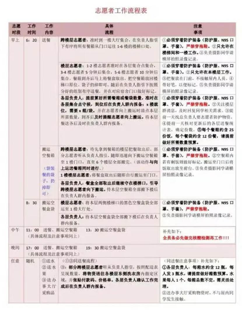 为了战“疫”胜利,她不得不紧急制定志愿服务工作的系列“战略决策”。为了圆满完成每次的志愿服务,她指定了各层负责人建立了工作群,并在一天的反复摸索后连夜制作了“南四公寓分布分组图”、“哲社志愿者排班表”和“志愿者工作流程表”,而后也随着实际情况的变化不断优化战略方案,致力于减轻志愿者们平均工作压力,提升团队整体的工作效率,从而为服务南四所有同学而不懈努力。