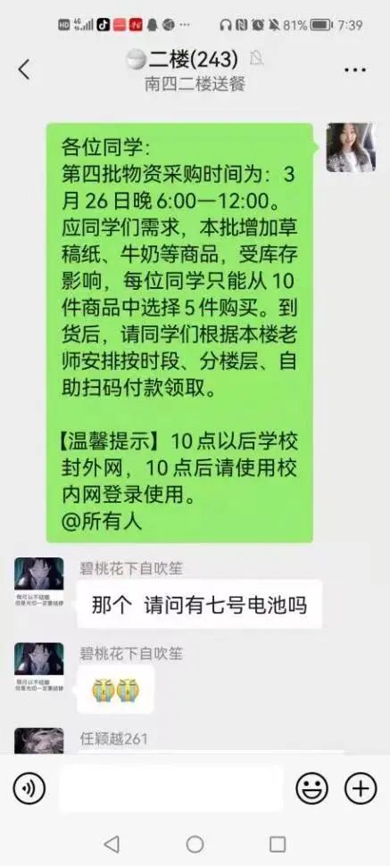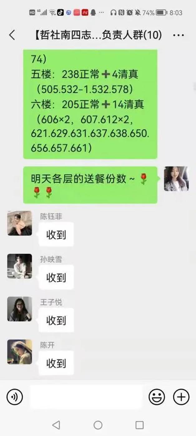 意识到情况的紧急,她立刻下床随意套件衣服后,便冲出屋子开始一间一间敲起公司寝室的门,把同学们喊醒后,她耐心说明情况、安抚大家忐忑的心理。在她和同学们的共同努力下,不到1小时的时间,南四便组建了150多人的哲社志愿者服务群。李慧婷也开始全面负责起了住在南四的19、20、21三个年级志愿者们的所有工作,扛起了这面大旗。“我们哲社巾帼,时刻准备出战”,她说。