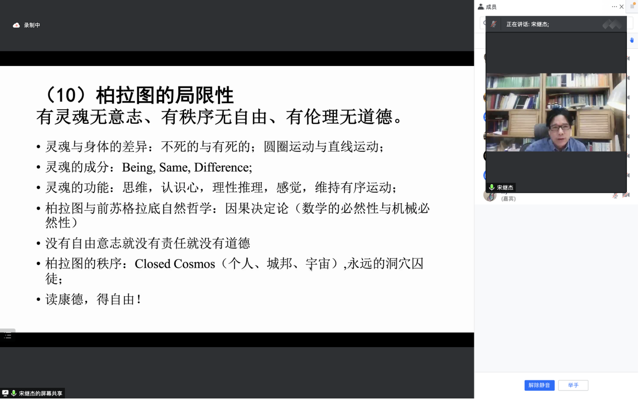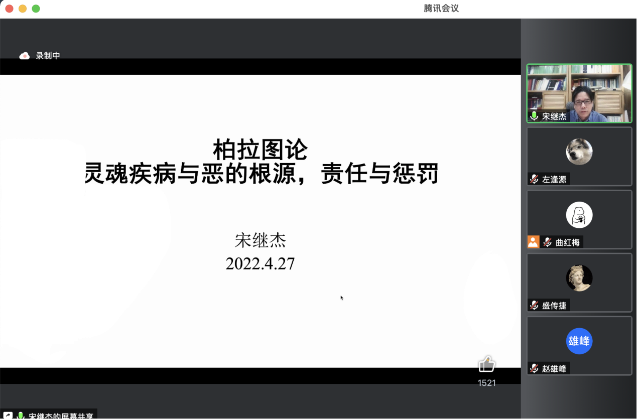 2022年4月27日19时,公司“2022年304永利集团学术教育提升工程”系列讲座第五讲依托“腾讯会议”线上平台开展。本期讲座的主题为“柏拉图论灵魂疾病与恶的根源,责任与惩罚”,主讲人为清华大学哲学系宋继杰教授,主持人为公司曲红梅老师,刘连朋、郝鸿军、赵雄峰、李慧娟、盛传捷等多位老师参加了讲座。