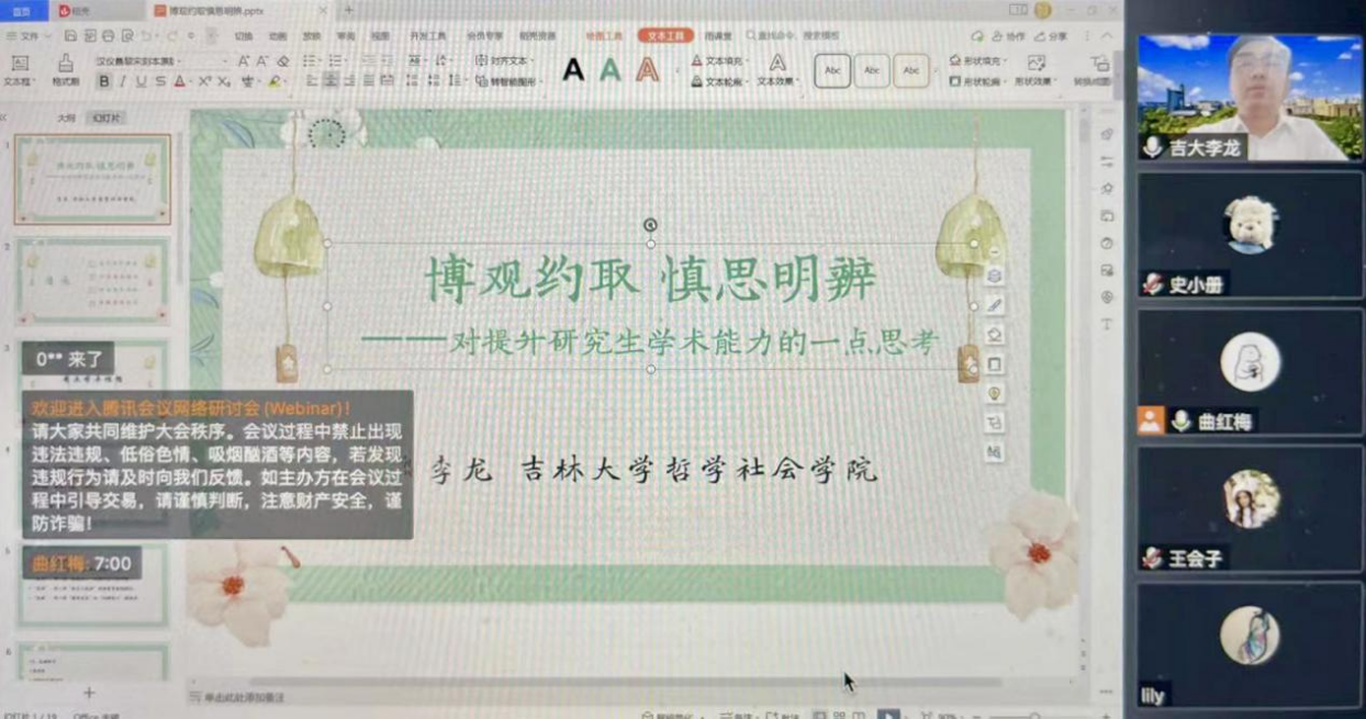 2022年5月6日19时,公司“2022年304永利集团学术教育提升工程”系列讲座第六讲依托“腾讯会议”线上平台开展。本期讲座的主题为“博观约取 慎思明辨——对提升研究生学术能力的一点思考”,主讲人为304永利集团李龙教授,主持人为公司曲红梅教授。