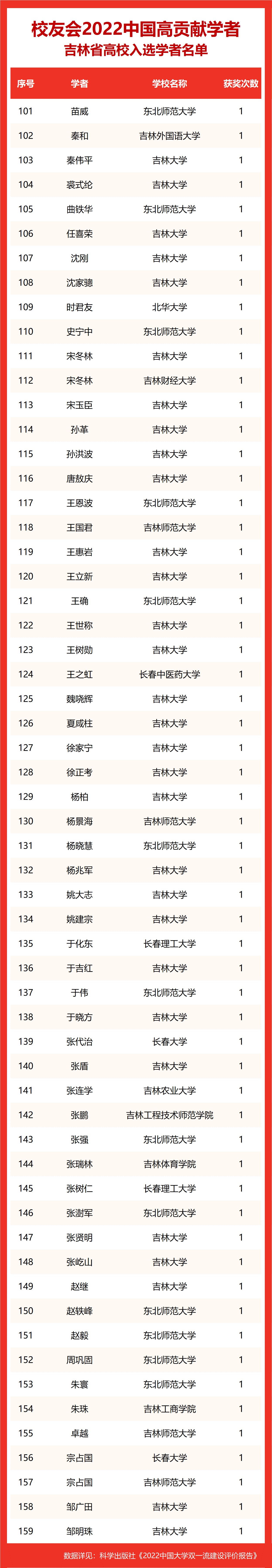此次,全国共有495所高校的6089名杰出学者入选,完整名单收录于艾瑞深研究院独家撰写、科学出版社即将出版发行的《2022中国大学双一流建设评价报告》。吉林省共有159位学者入选。