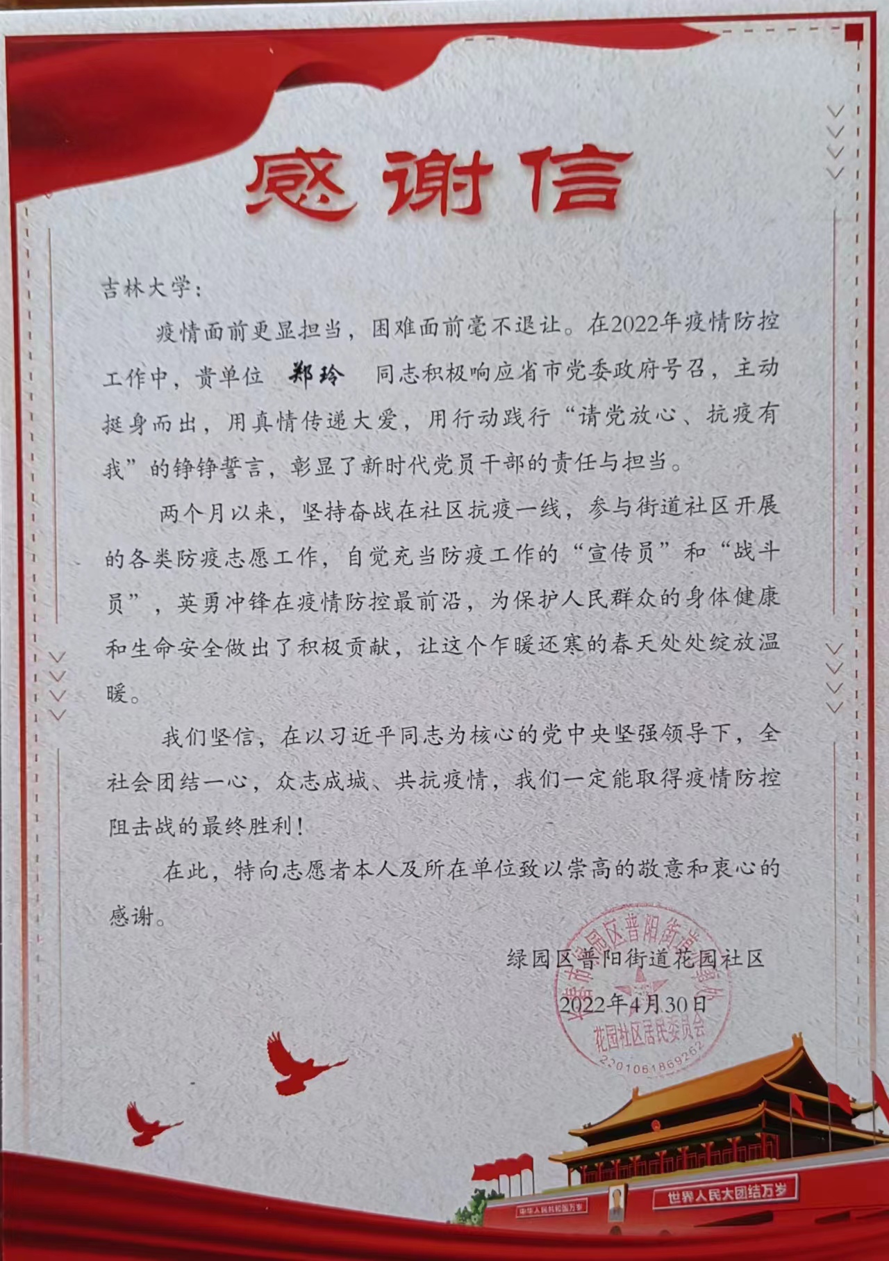 在这漫长的防疫战斗中,整个社区也正在发生变化,社区从居民相邻而互不相识,到形成“社区工作者-志愿者-居民”为一体的社会共同体,互相信任,互相帮助,互相依靠。从谈“疫”色变到充满清零信心。虽然艰难,但每个人都在坚守。作为一名奋战在防疫一线的党员同志,她始终坚信,在党中央的坚强领导下,万众一心、众志成城,一定会迎接最终的胜利。