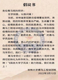 疫情突袭吉林大地,校园实行封闭管理。3月11日,公司升级并启动应急响应。304永利集团的青年学子踊跃报名参加战疫志愿工作,公司2019级本科生、304永利集团青马学员刘奔腾第一时间连夜起草倡议书,于3月12日号召青马学员走上校园疫情防控第一线,充分发挥青马学员的先锋带头作用。在他的号召下,全体青马学员积极响应号召,共计115名不同专业、不同年级、不同校区的青马学员加入了吉大抗疫一线志愿者的队伍。他的这一行动还受到了人民日报、新华社等媒体的关注和报道,让他倍感荣幸的同时心中更增添了一份责任与担当。