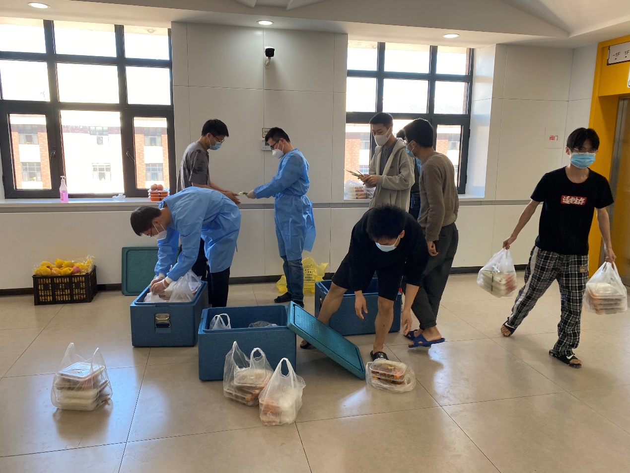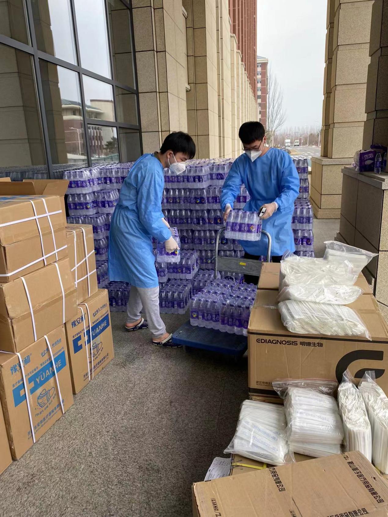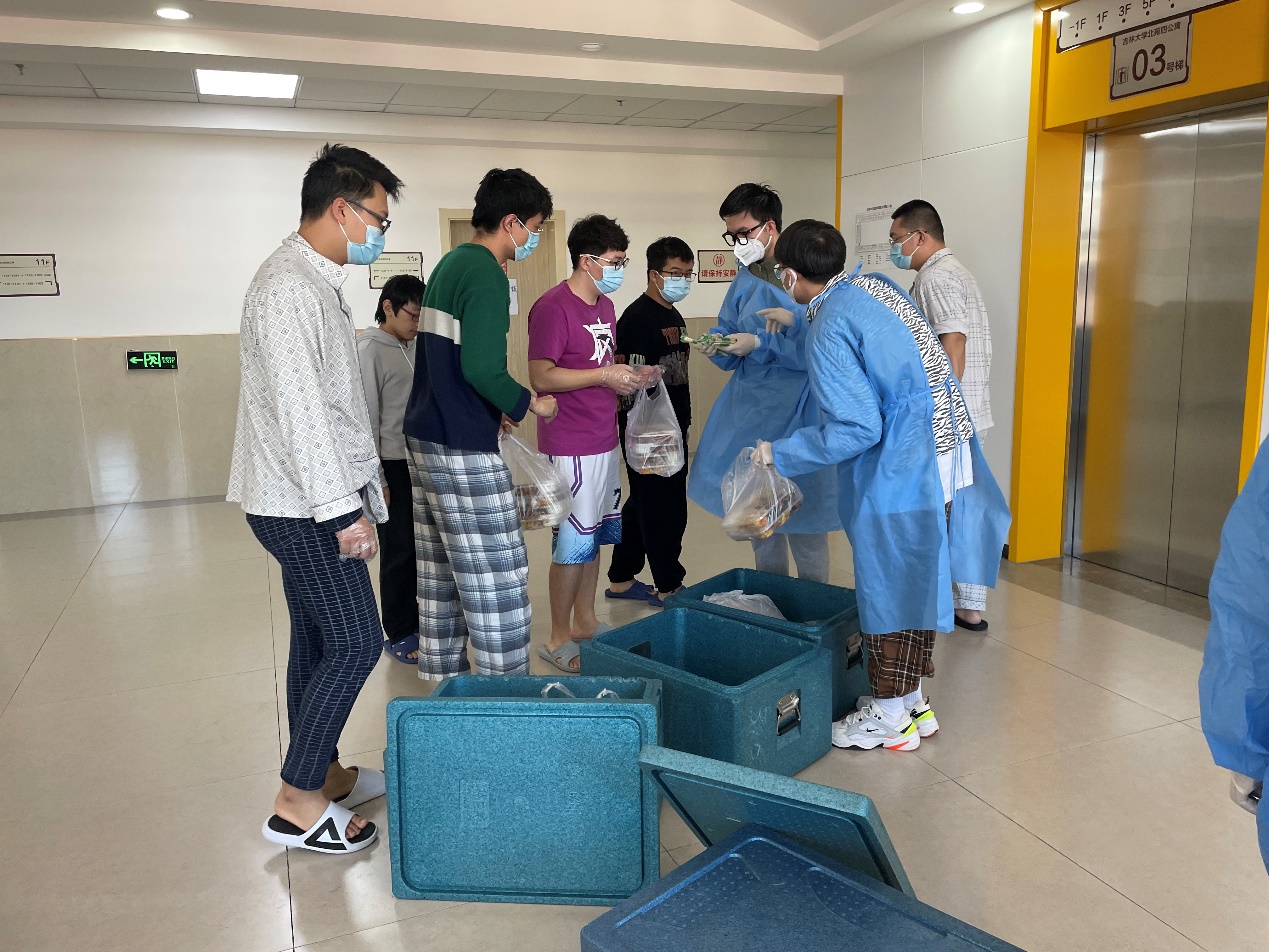 罗宇超:清晨,伴随闹钟的响起,我和小伙伴们不约而同地起床开始穿着防护服、佩戴N95口罩,就这样,楼内志愿者一天的工作开始了。从每日餐饮的配送,到防疫物资的分发,“大白”和“小蓝”穿梭于楼道之中,无需多言,多日的合作已经形成了彼此间的默契。对于物资如何清点、快速装卸等问题,我们不断优化方案、不断完善细节,尽全力使工作变得更加高效。从电梯口接过物资,再派发到每位同学手中,尽管我们穿着的防护服很闷很厚,但当我们收到来自祖国四面八方“吉大学子”捐赠的爱心物资、看见每位同学的笑意、寝室门上感谢的标语、感受到公司领导和各位老师的关心的时候,我们的内心都充满动力。作为一名新时代的青年,我们就该去为战胜疫情贡献出自己的一份力量!