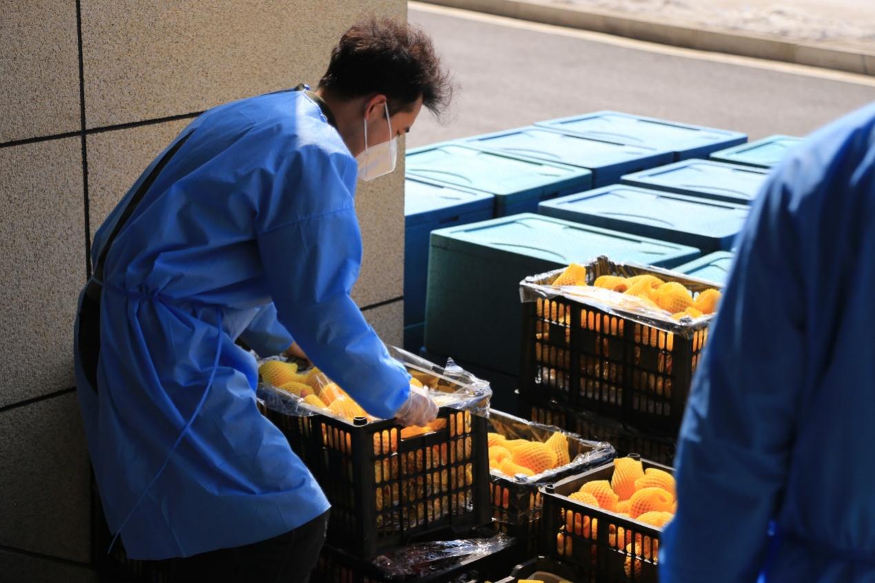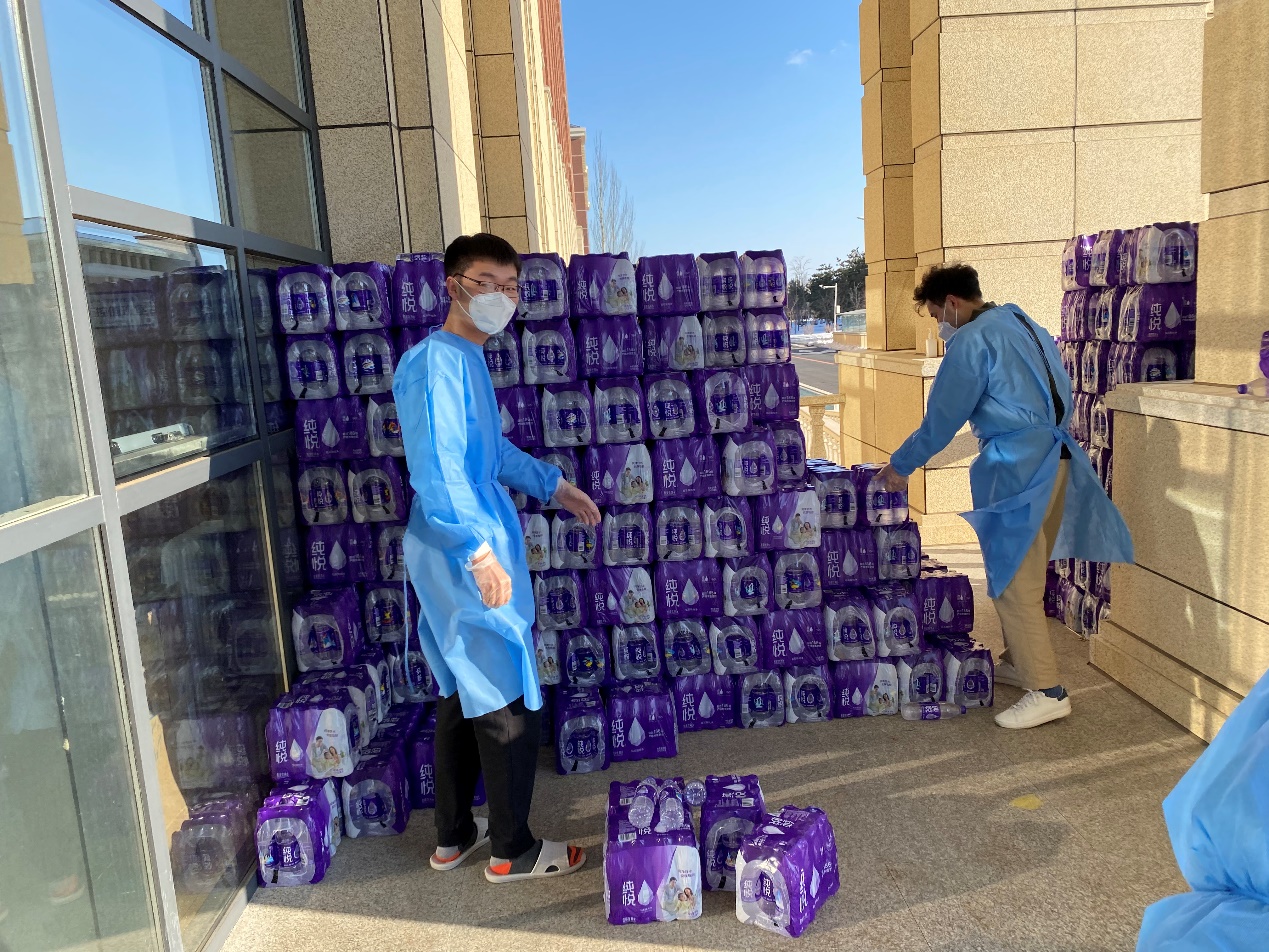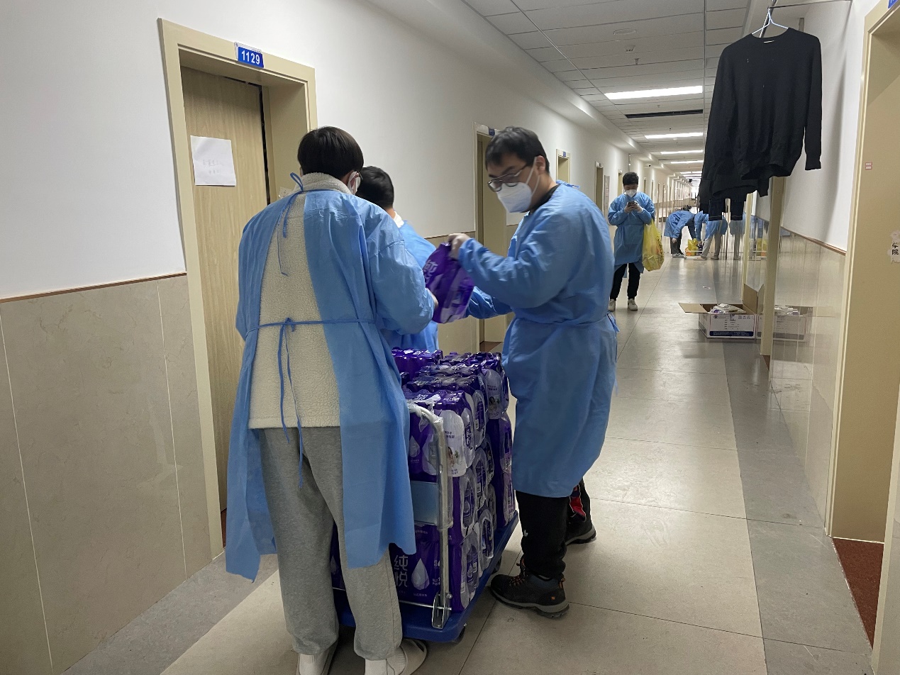 罗宇超:清晨,伴随闹钟的响起,我和小伙伴们不约而同地起床开始穿着防护服、佩戴N95口罩,就这样,楼内志愿者一天的工作开始了。从每日餐饮的配送,到防疫物资的分发,“大白”和“小蓝”穿梭于楼道之中,无需多言,多日的合作已经形成了彼此间的默契。对于物资如何清点、快速装卸等问题,我们不断优化方案、不断完善细节,尽全力使工作变得更加高效。从电梯口接过物资,再派发到每位同学手中,尽管我们穿着的防护服很闷很厚,但当我们收到来自祖国四面八方“吉大学子”捐赠的爱心物资、看见每位同学的笑意、寝室门上感谢的标语、感受到公司领导和各位老师的关心的时候,我们的内心都充满动力。作为一名新时代的青年,我们就该去为战胜疫情贡献出自己的一份力量!