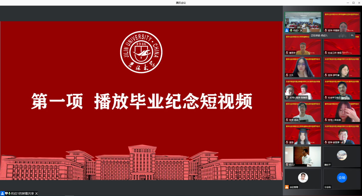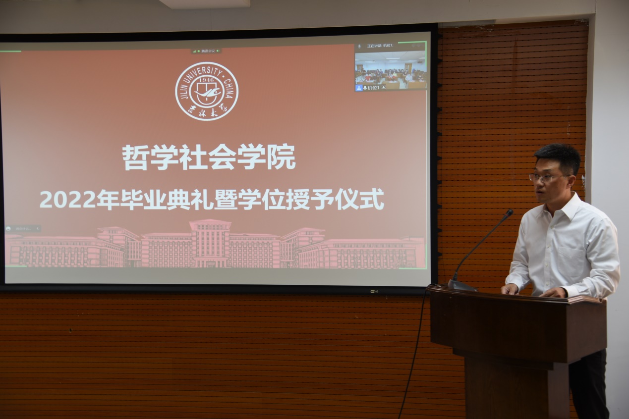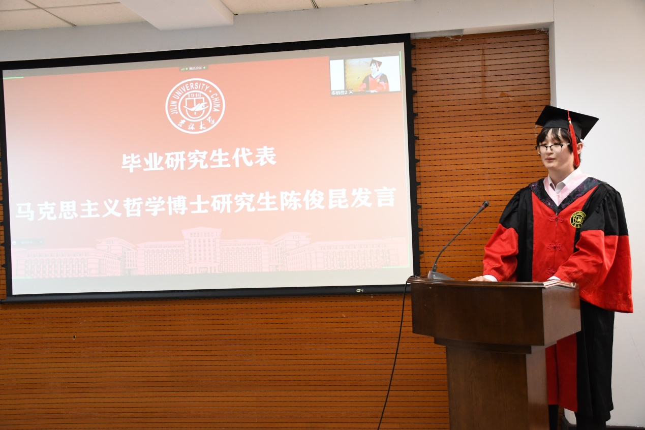 典礼第三项,员工代表发言。首先,毕业研究生代表陈俊昆同学发言。“一日归属吉大,一生念念不忘,”他说,“虽然此刻我们满怀毕业的激动和喜悦,但作为一名吉大人,一名哲社人,无论我们身在何方,无论我们相约何时,都请记得自己的身份。取得的成就,记得常与母校分享。”