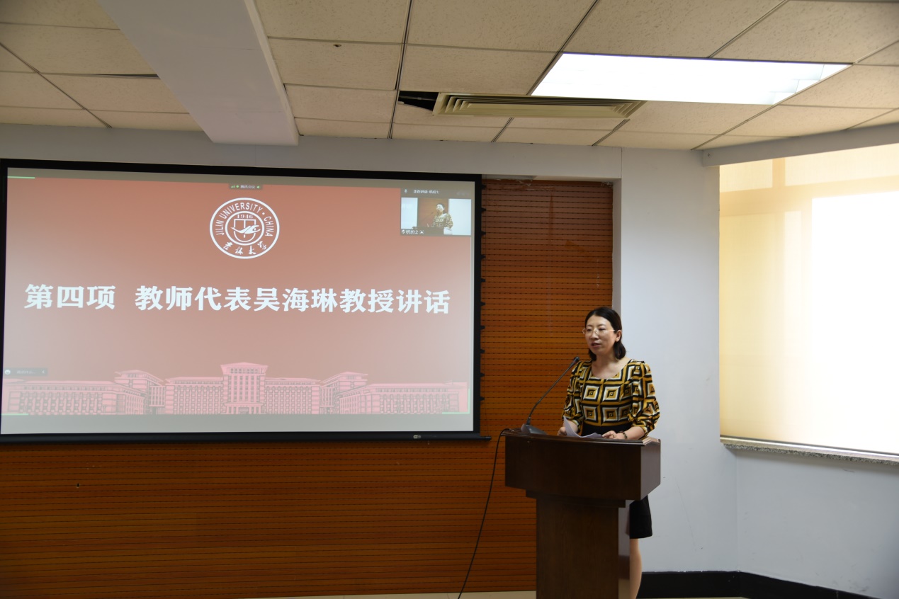 典礼第四项,教师代表吴海琳老师讲话。吴老师谈到,希望员工们用专长武装自己;在心中种下种下梦想的种子;广交朋友,留下永远的财富;修炼通达的性情,接受自己的不完美,不断挑战自我、超越自我,牢牢记住哲学的慎思明辨、社会学大类的担当、心理学对生命质量的关注,向前看到希望,向后留下回忆。心中向阳,眼底有光,成为自己想去成为的人。