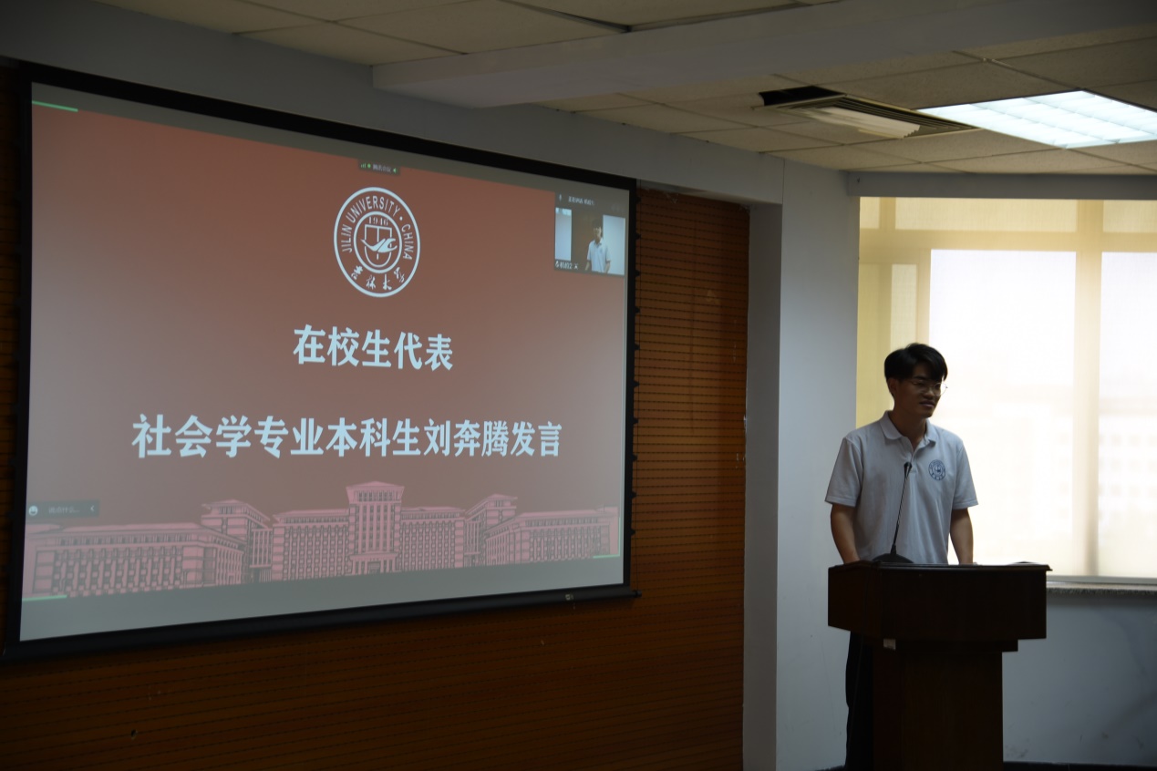 接着,毕业本科生代表刘昕冉同学发言。他提到,身为人文社科领域的员工,务必做到“为人为学,其道一也”,作为迈向学术殿堂、走出境域国门、步入社会职场的毕业生,只要用心浇灌,这片土地上终会树冠成荫、硕果充盈,也会发现自己眼眸清澈、内心有光,终能抵达各自心中的彼方。