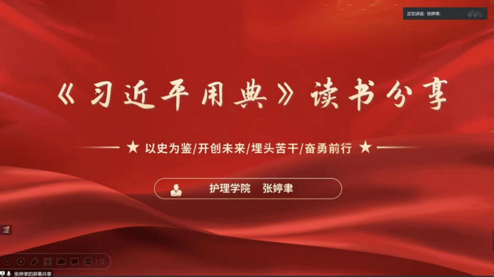 来自护理公司的张婷聿同学分享了《习近平用典》一书中与其最有渊源的《信念篇》。高三时的她偶然读到“志之所趋,无远勿届,穷山距海,不能限也。志之所向,无坚不入,锐兵精甲,不能御也”,这句话发张婷聿同学的思考。在深入阅读后,张婷聿同学分享了这句话对自己的启发与感悟:国家要有目标、人民要有目标、青年更要有目标。作为新时代的老员工,更应珍惜自己宝贵的青春年华,坚持理想,脚踏实地,将自己的人生深深扎根在祖国大地上。