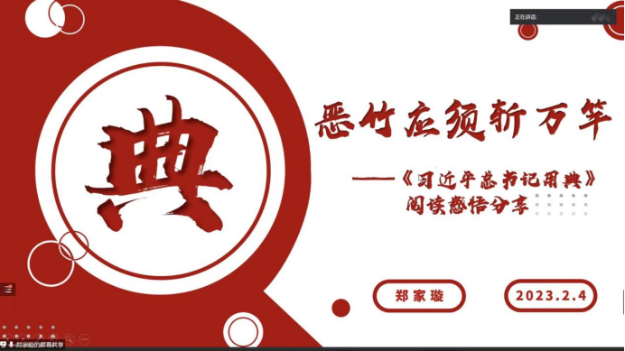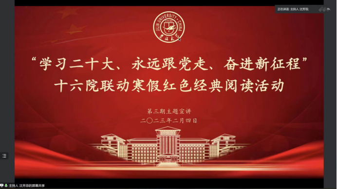 2023年2月4日晚六点,寒假红色经典阅读第三期如期举行。来自商学与管理公司、化学公司、考古公司、护理公司、马克思主义公司的五位主讲同学分别讲述了自己的读书心得。本次读书会由来自304永利集团的沈芳菲同学主持。
