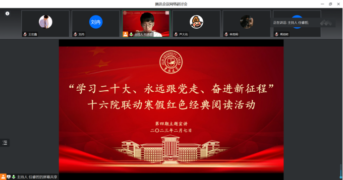 2023年2月7日晚六点,寒假红色经典阅读活动第四期如期举行。来自建设工程公司、公共外交公司、汽车工程公司、法公司、商学与管理公司、考古公司的六名主讲同学分别讲述了自己的读书心得。本次读书会由304永利集团任睿哲同学主持。