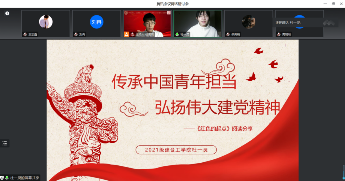 建设工程公司杜一灵同学分享的主题是“传承中国青年担当,弘扬伟大建党精神”。她号召大家不畏艰难,勇攀高峰,心系家国,以青春之我创建青春之国家,以积极乐观向上的态度面对生活,努力奋斗,传承中国青年担当,弘扬伟大建党精神。