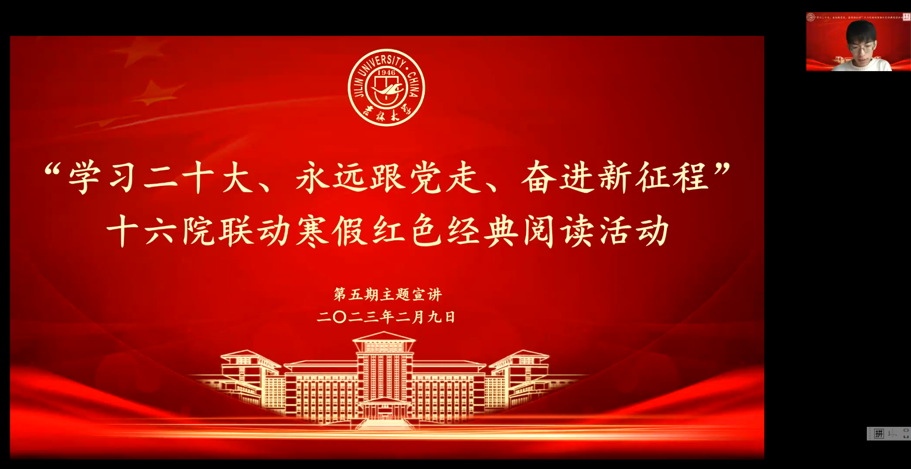 阅读经典,有助于我们客观清醒地学习中华优秀传统文化和社会主义先进文化,细致深刻地感悟党领导人民过去五年的工作和新时代十年的伟大变革,做到明理增信、崇德力行。在五位主讲同学和参会同学们的热情交流中,第五期寒假红色经典阅读活动圆满结束。