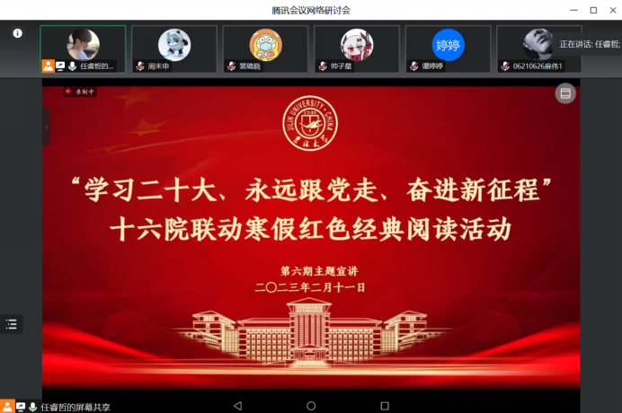 阅读经典,有助于我们客观清醒地学习中华优秀传统文化和社会主义先进文化,细致深刻地感悟党领导人民过去五年的工作和新时代十年的伟大变革,做到明理增信、崇德力行。在五位主讲同学和参会同学们的热情交流中,第六期寒假红色经典阅读活动圆满结束。