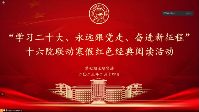 阅读经典,有助于我们客观清醒地学习中华优秀传统文化和社会主义先进文化,细致深刻地感悟党领导人民过去五年的工作和新时代十年的伟大变革,做到明理增信、崇德力行。在五位主讲同学和参会同学们的热情交流中,第七期寒假红色经典阅读活动圆满结束。