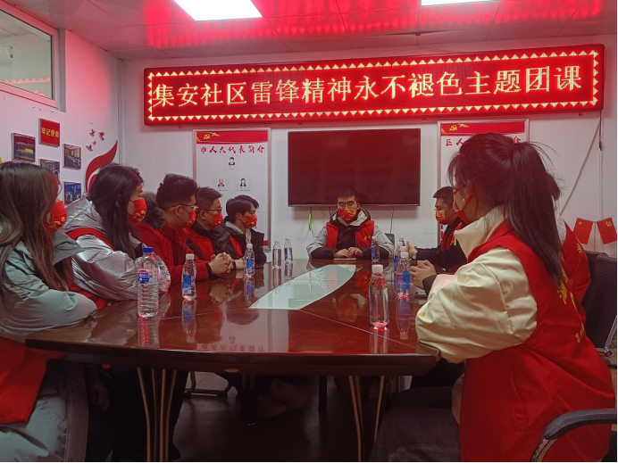 辛勤劳动后,同学们回到室内,与社区工作人员们共上一节别开生面的主题团课。在谈论中,大家就雷锋精神的时代内涵踊跃交流、热情分享,团课中洋溢着热烈的氛围。