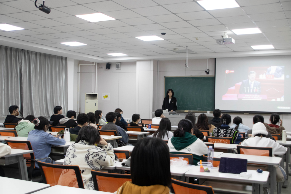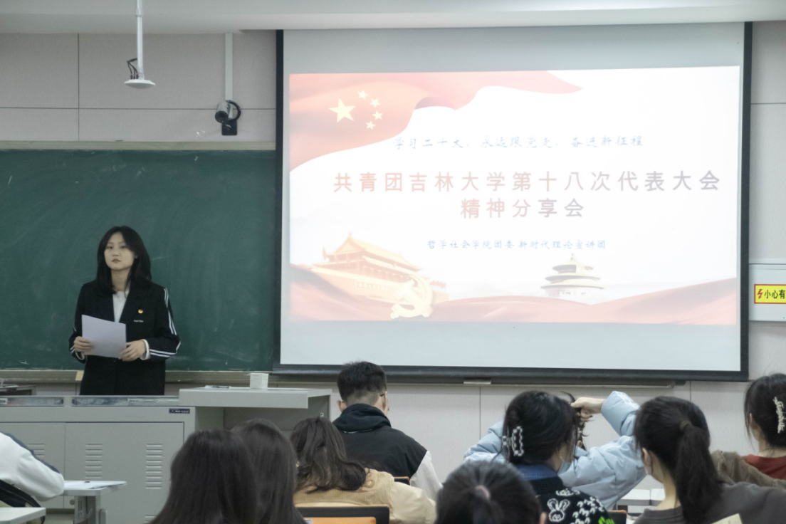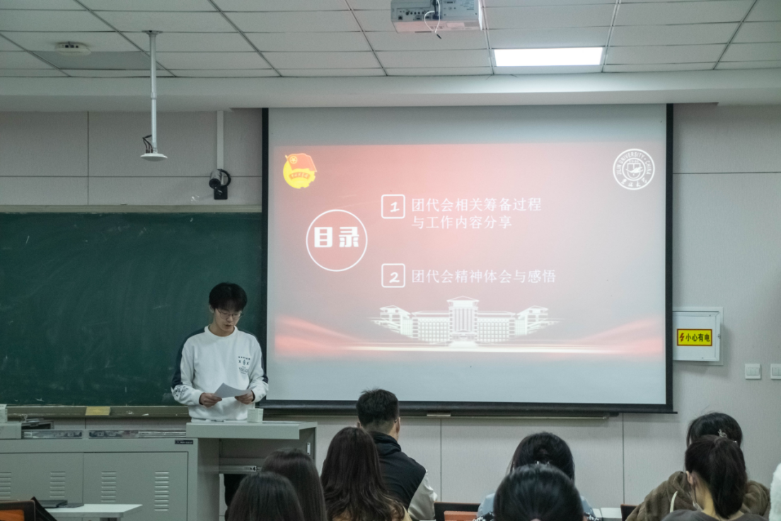 然后,由公司2022级本科生张惠侠同学进行心得分享。作为团代会的一名工作人员,他向同学们简要介绍了团代会的整体筹备过程,表达了对积极筹备、辛勤付出的全体团代会工作人员的诚挚感谢。而后,他向同学们分享了公司党委书记姜治莹老师的讲话精神,呼吁大家永怀爱党爱国的赤忱担当和敢拼敢闯的创新意识,心怀国之大者,努力成为有理想、敢担当、能吃苦、肯奋斗的新时代吉大好青年。