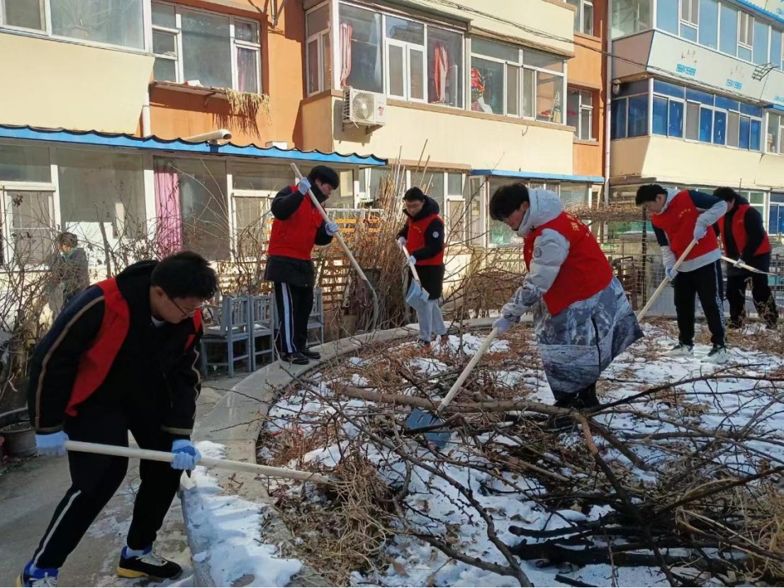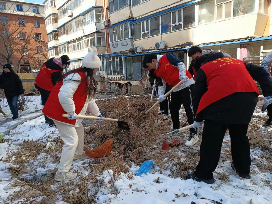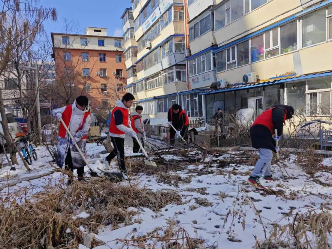 志愿者同学们统一身着红马甲,手戴白线手套,以积极饱满的精神风貌与高度负责的志愿精神开展志愿活动。走进社区,同学们在社区负责人的带领下领取工具,对小区内部影响美观的枯枝落叶、积雪和垃圾进行了深入的清理与打扫。