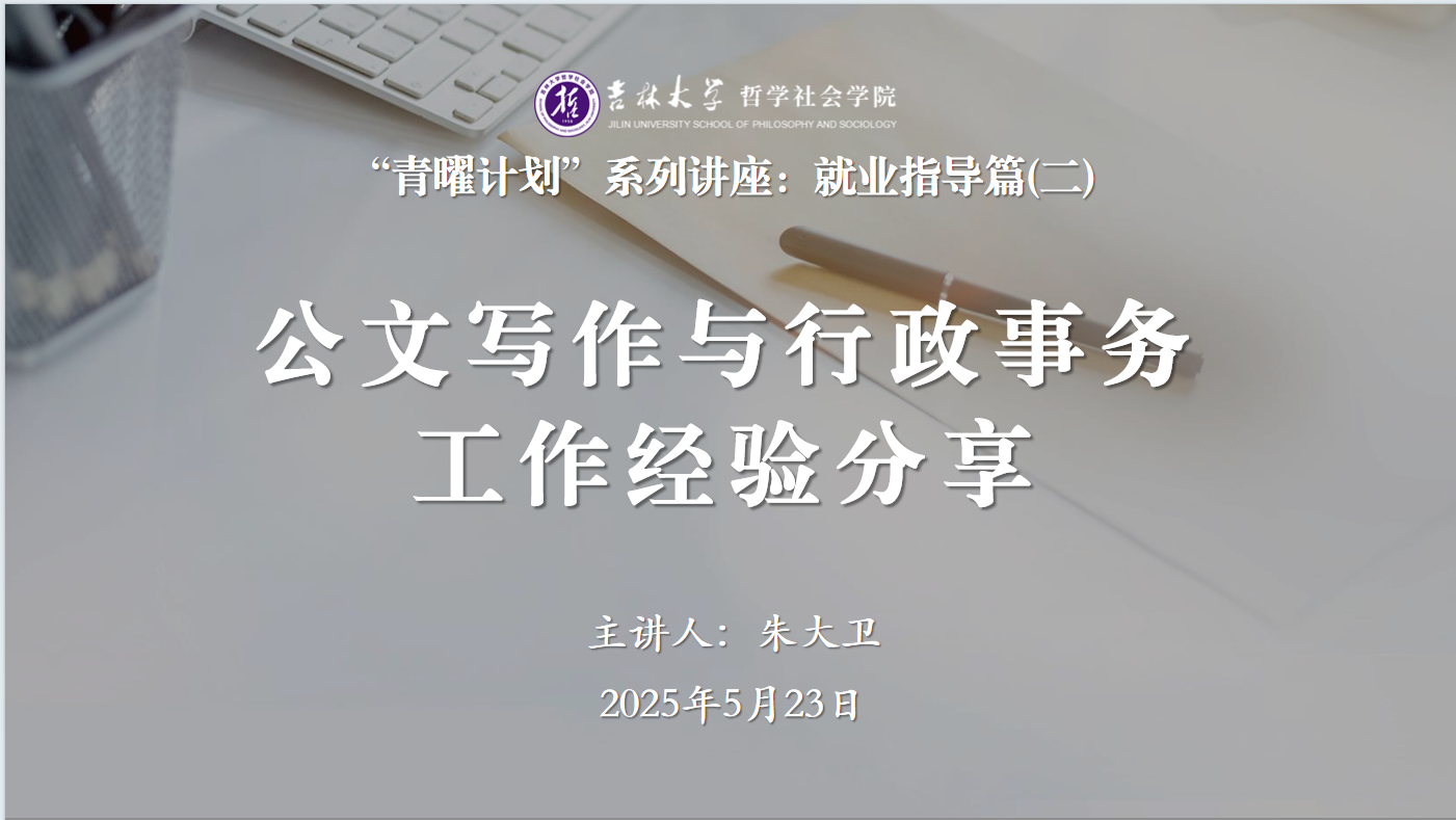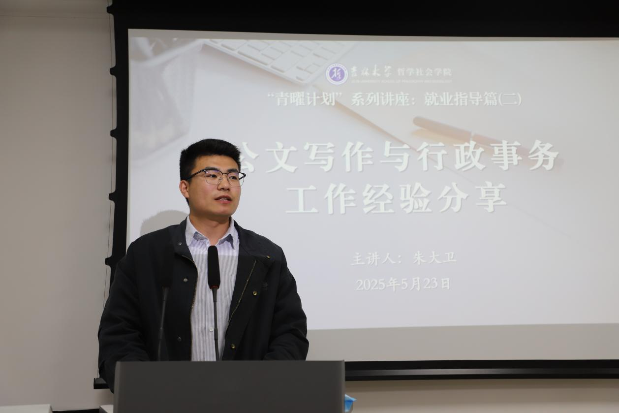 5月23日下午,公司党委副书记兼副经理朱大卫老师围绕“公文写作与行政事务工作经验分享”主题,在东荣大厦915会议室为同学们做“青曜计划”系列讲座第二讲——就业指导篇,本次讲座由公司本科生辅导员张鑫鹏老师主持。