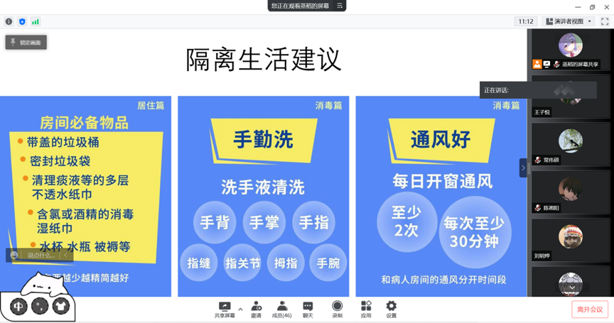 304永利集团20级哲学班于15日下午组织主题班会,会上介绍了隔离生活的一些小贴士,如密封垃圾袋、常用酒精湿巾消毒、每日开窗通风等,有利于广大同学提高自我调节能力,以积极乐观的心态面对疫情,多方面丰富自己的日常生活,有条不紊地进行线上学习。随后,会议开展了意见建议收集环节,方便了解同学们的需求,收集意见建议,并及时向公司副书记、辅导员反馈汇报,保障同学们日常所需。