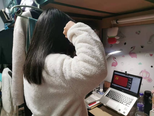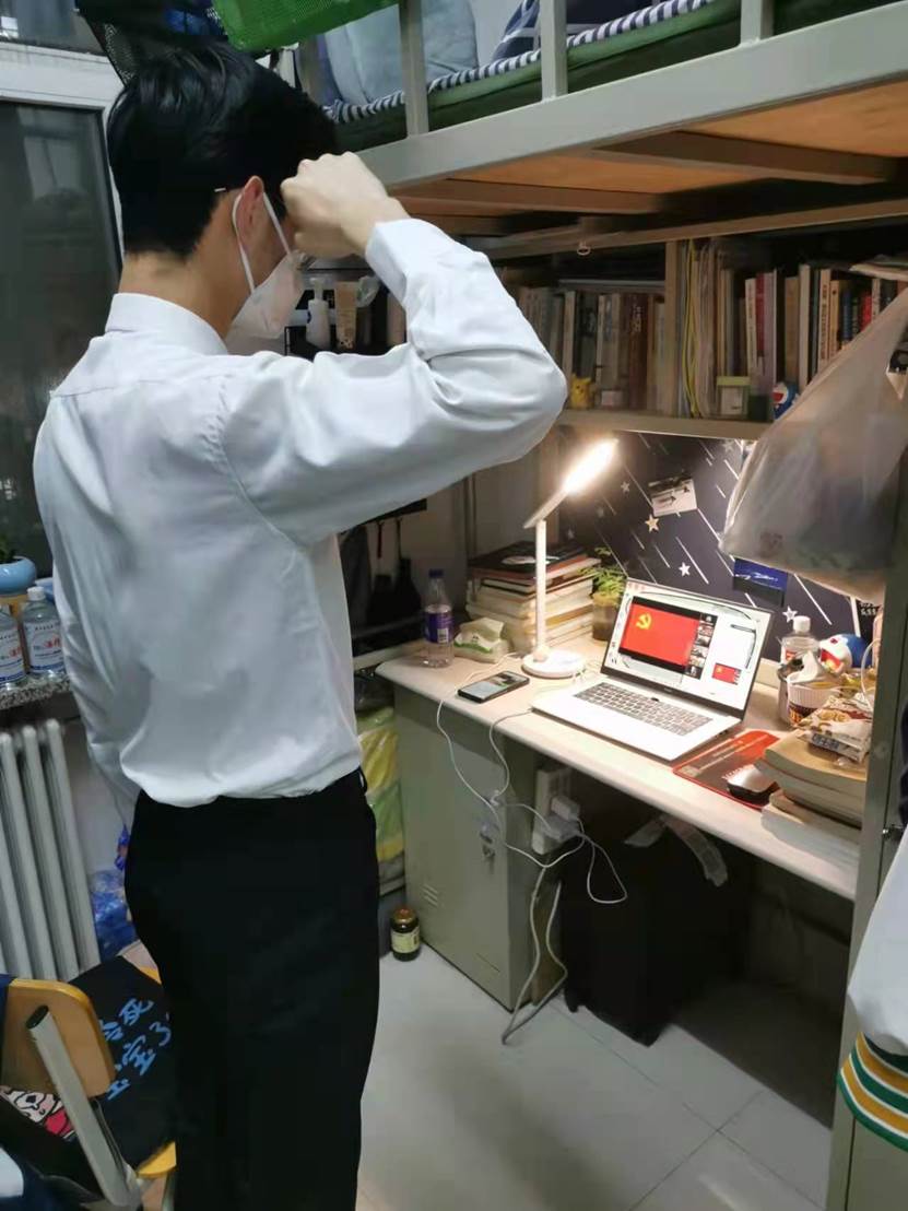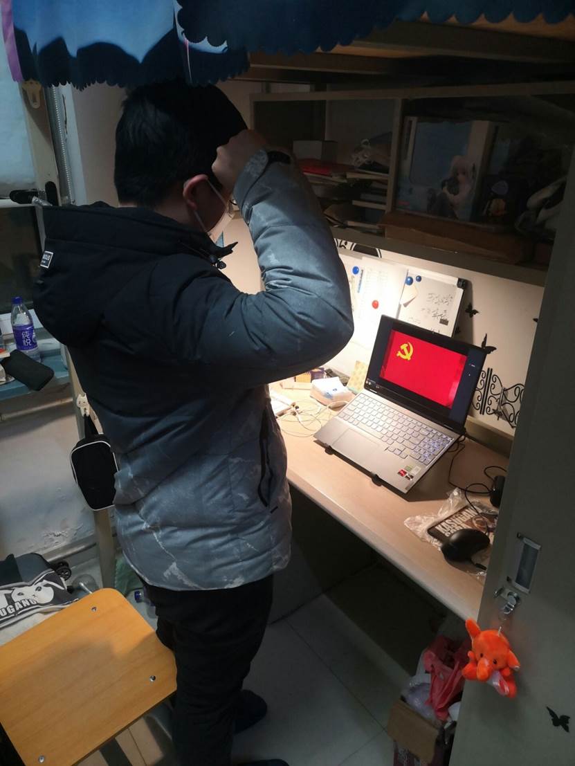 第二部分主题为“不忘初心,牢记使命”。由19级本科生孟令婕同志带领第一党支部全体党员重温入党誓词,在那一声声中“我志愿加入中国共产党”的铮言中,每一位党员都热情似火,眼神坚定,声声誓言传递着必然战胜疫情的决心。