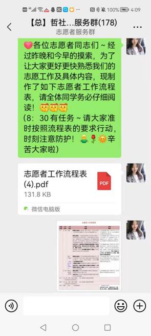 3月14日,为了第二天大家能圆满顺利地完成首次志愿工作任务,我指定了各楼层负责人,并在大家帮助下连夜制作了哲社志愿者排班表和南四公寓分布分组图,编辑了第二天要发布的所有工作通知。经过第一次送晚餐工作的摸索后,我连夜制作并发布了志愿者工作流程表,努力让我们哲社的团队变得越来越好!此后,我的主要工作任务就是作为公寓二楼负责人时刻关注二楼同学需求,作为哲社志愿者负责人在志愿时段前和老师、其他公司同学们对接,到点指引我们的最美志愿者团队有序工作,所有工作完成后走两遍楼进行最后的确认。工作确实又累又冷,但我的内心却十分火热。